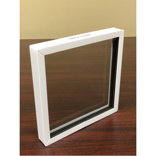 While a triple pane window yields a better insulating value (U-value) of a window, the lack of a Low-E coating results in a window that underperforms, both in terms of insulating, as well as the Solar Heat Gain Coefficient (SHGC). Comparing this window to a Low-E coated window will help build the value of your high-performance window product. The standard window is constructed of 1/8" glass with 1/4" spacers. Other options may be available. With the protective white vinyl wrap on the perimeter, the resulting window dimensions are 7.2 x 7.2 x 1.0 inches.